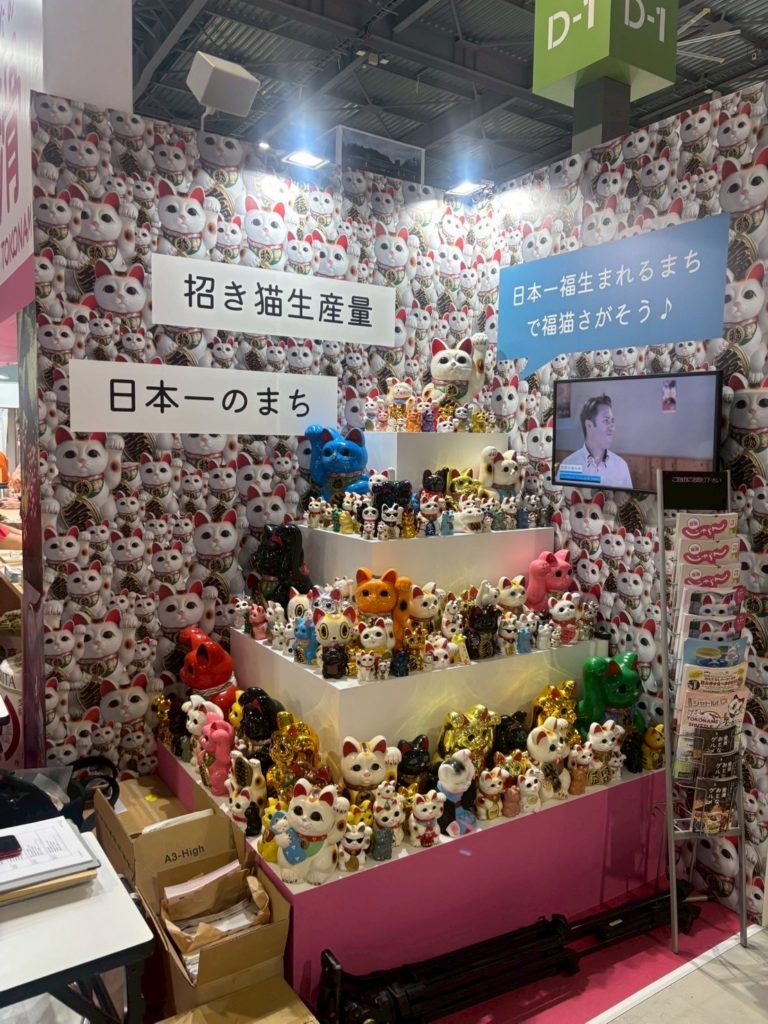 「招き猫生産日本一」の常滑らしく、ブースには色とりどりの招き猫がずらり!